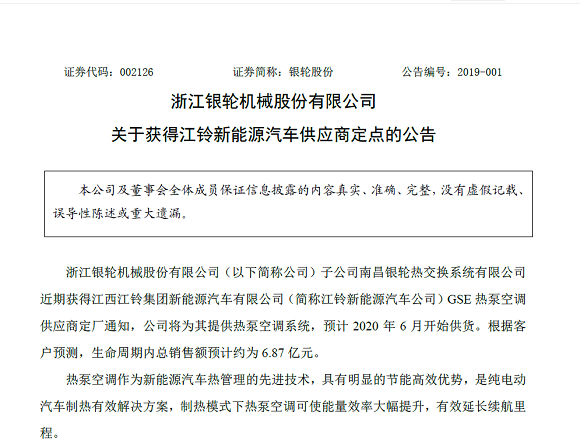 浙江银轮机械股份有限公司(以下简称公司)子公司南昌银轮热交换系统有限公司近期获得江西江铃集团新能源汽车有限公司(简称江铃新能源汽车公司)GSE热泵空调供应商定厂通知,公司将为其提供热泵空调系统,预计2020年6月开始供货。根据客户预测,生命周期内总销售额预计约为6.87亿元。