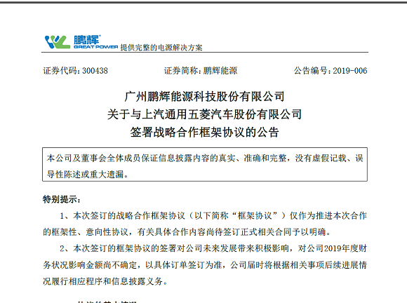 2019年1月10日,广州鹏辉能源科技股份有限公司与上汽通用五菱汽车股份有限公司在柳州签订了《关于新能源汽车产业战略合作框架协议》,双方签署框架协议,旨在全面实现长期合作,双方将深度探讨并合作研发标准化、平台化动力电池系统,共享资源平台,加速正向开发;鹏辉能源将向上汽通用五菱多车型平台提供适配的动力电池系统,实现可持续的共同发展。