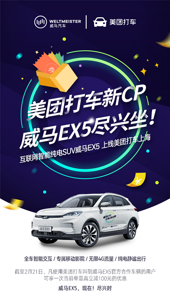 1月30日消息,威马汽车与美团打车今日达成战略合作。据悉,此次合作,威马汽车将旗下首款量产互联网智能纯电SUV EX5引入到美团打车平台,尝试将新零售引入网约车消费场景,为用户提供便捷的出行服务体验。