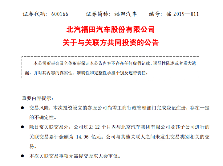 附件:北汽福田汽车股份有限公司关于与关联方共同投资的公告
