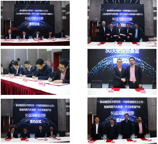 2019年被称为5G元年,也是5G大规模试验开展、与各个产业融合应用落地的重要一年。在5G应用联合创新签约发布会上,共完成了三份合约的签订,包括中国联通5G创新中心、移动所、南京联通、南京市工业互联网平台研究院、新华三集团面向工业互联网领域5G应用开发的合作协议,移动所、南京联通、江苏智行未来汽车研究院、开沃新能源汽车集团、上汽大通汽车有限公司面向智能网联汽车的5G应用开发合作协议,以及移动所与壹诺创投签署成立5G天使投资基金的合作协议。