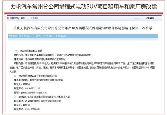 根据公示资料显示,力帆将租用常州车和家标准厂房建设有限公司和江苏车和家汽车有限公司现有厂房、全厂性公用设施和生活辅助设施,在厂区内改造冲压、焊接、涂装、总装车间并购置生产设备。项目建成后,形成10万辆增程式纯电动SUV的生产能力。项目总投资18.18亿元,计划于201 [详细]