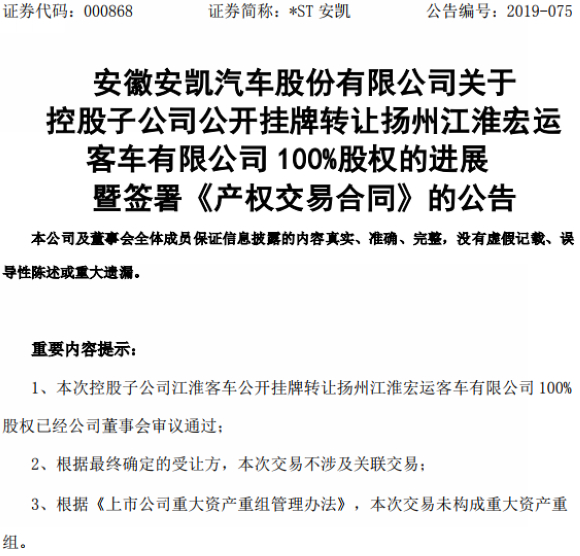 2019年7月2日,扬州宏运100%股权转让在安徽省产权交易中心挂牌期满,安徽省产权交易中心征集到1个符合条件的意向受让方,扬州宏运车业有限公司(以下简称“宏运车业”)为最终受让方。2019年7月26日,江淮客车与宏运车业签署了《产权交易合同》,将所持有的扬州宏运100%股权以2,838.52万元的价格转让给宏运车业。