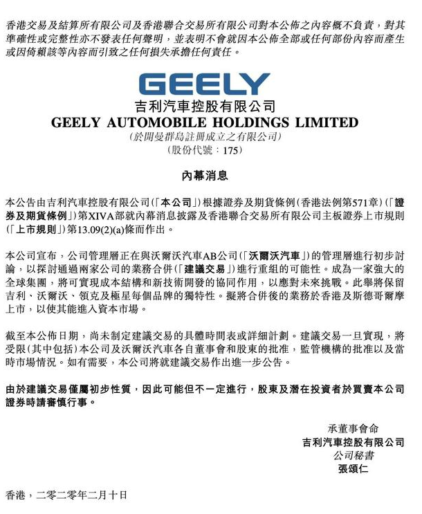 2月10日吉利汽车发布公告称,公司正筹划与沃尔沃汽车进行业务重组。重组后的资产将纳入吉利汽车香港上市公司,并将考虑未来在瑞典上市。整合后的新集团将保持沃尔沃汽车、吉利汽车、领克和极星等品牌的独立。