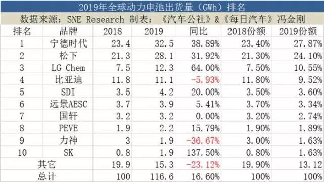 根据韩国SNE Research发布的2019年全球锂离子动力电池出货量排行榜,宁德时代连续三年位居榜首,这得益于宁德时代在国内电池行业的垄断地位,以及中国这个全球第一的新能源汽车市场。