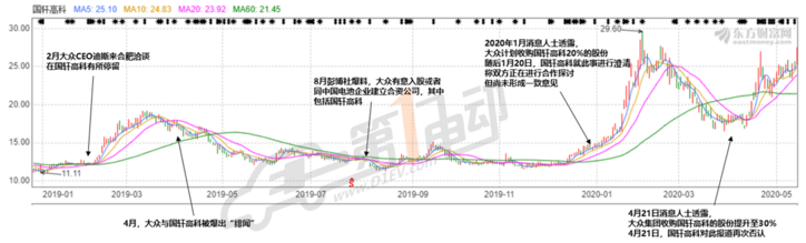 上述图片对于传了一年多的 “绯闻”做了一个简单梳理,可以看到,在这些事件的时间点上,国轩高科的股价也几经起起落落。