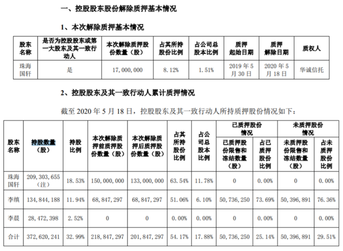 5月21日,国轩高科股份有限公司(002074.SZ,下称“国轩高科”)发布公告,其第一大股东珠海国轩部分股份已解除质押。这是三天里国轩高科的第二份公告。