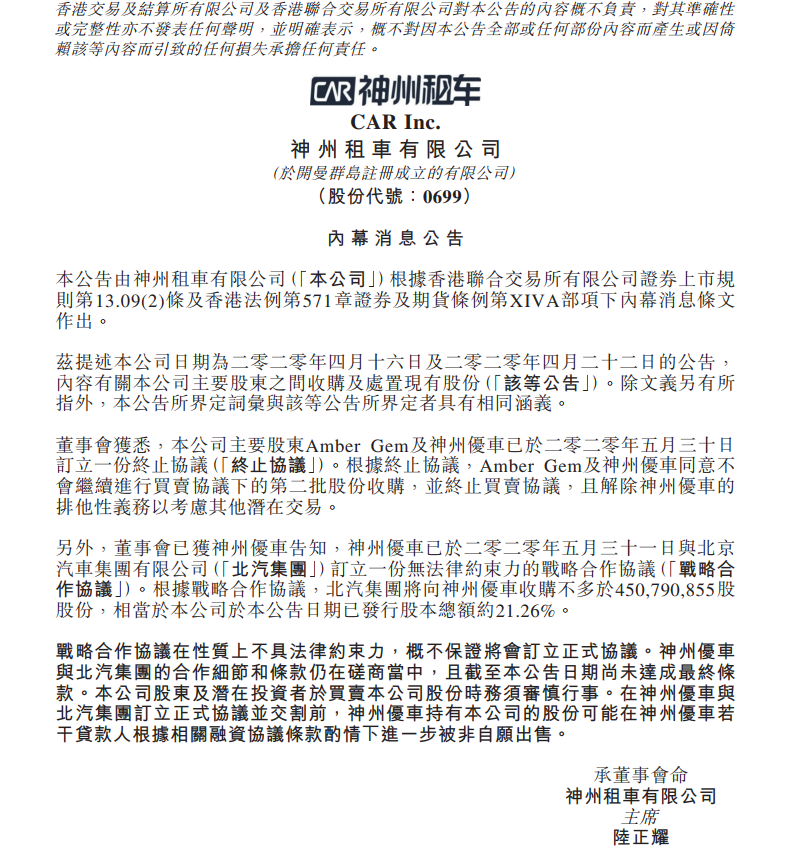 6月1日,神州租车发布公告称, 大股东神州优车已于5月31日与北京汽车集团有限公司(以下简称“北汽集团”)订立一份无法律约束力的战略合作协议。北汽集团将向神州优车收购不多于450,790,855股股份,相当于神州租车已发行股本的21.26%,也是神州优车所持神州租车的全部股份。