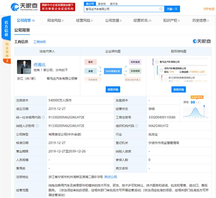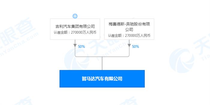 根据信息显示,智马达汽车有限公司注册资本54亿人民币,法定代表人为佟湘北,注册地址位于浙江省宁波市杭州湾新区,经营范围包括纯电动乘用汽车及其零部件和模块的技术开发、研发、技术许可和转让、技术服务和咨询、批发和零售、进出口、售后服务。天眼查股东信息显示,该公司由吉利汽车集团有限公司和梅赛德斯-奔驰股份有限公司共同持股,持股比例均为50%。
