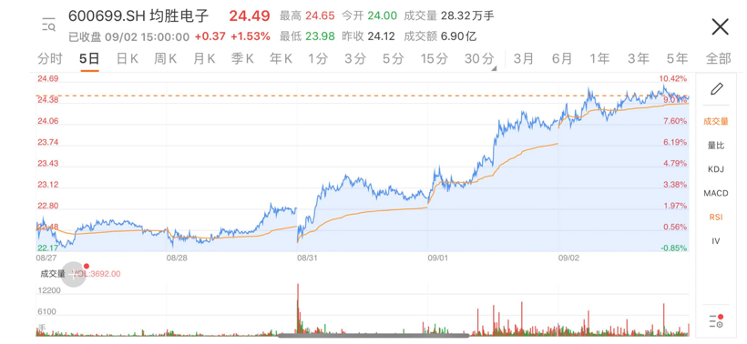 近五日均胜电子股价走势图;图片来源于富途牛牛