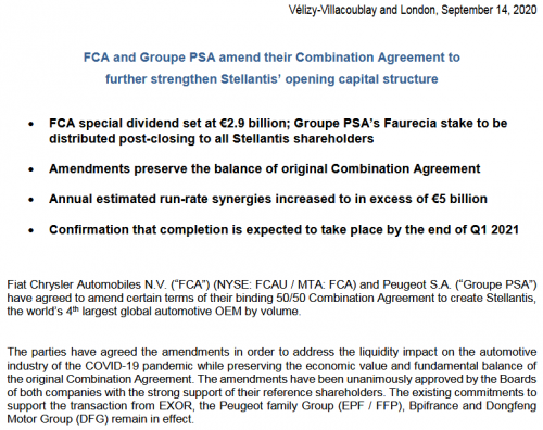 此前FCA和PSA签署协定,两家公司将以50:50的持股比例全面合并,组建形成全球第四大汽车制造商,新集团将命名为“Stellantis”。此次修改协议,则主要是对PSA子公司佛吉亚的股权分配,以及FCA备受争议的高额特别股息相关内容进行更改。