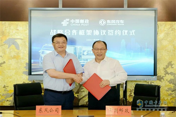 2021年6月25日,东风汽车集团有限公司与中国邮政集团有限公司在北京签署战略合作框架协议。双方将积极构建在新型开放格局下的央企合作,在市场拓展、整车采购及车辆运营、金融、寄递物流、服务体系共建、厂区综合服务、智慧物流等领域巩固深化现有合作,积极探索新合作机会,实现共创共赢。
