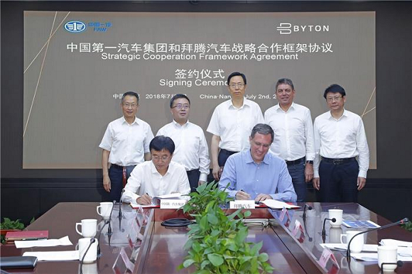 7月2日,拜腾与中国第一汽车集团有限公司在南京签署了战略合作框架协议,双方将充分发挥产业协同作用,在平台技术、投资入股、零部件采购等方面开展一系列合作。