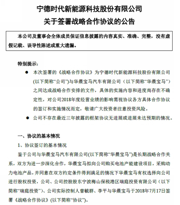 继7月11日宝马集团已与宁德时代确立了价值40亿欧元的电芯采购意向后,7月17日午间宁德时代发布公告称,鉴于公司与华晨宝马是长期战略合作关系,双方为进一步深化合作,华晨宝马拟向公司购买电池产能建设项目,采购动力电池产品,并同意在双方约定条件得到满足的情况下华晨宝马有权选择向公司进行股权投资,公司、公司控股股东瑞庭投资、公司实际控制人曾毓群、李平与华晨宝马于2018年7月17日签署《战略合作协议》。该战略合作协议有效期为自协议生效之日起54个月。