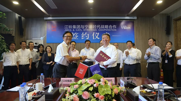 7月25日,宁德时代与江铃集团签订战略合作协议。宁德时代董事长、创始人曾毓群,江铃集团党委书记、董事长邱天高出席签约仪式,宁德时代总裁周佳、江铃集团总经理陈远清签署并交换协议。