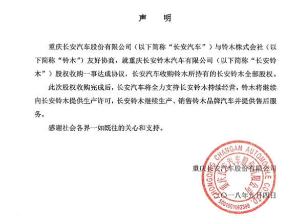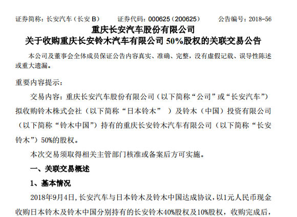 今天(9月4日),长安汽车发布公告称,公司与日本铃木及铃木中国达成协议,以1元人民币现金收购日本铃木及铃木中国分别持有的长安铃木40%股权及10%股权。收购完成后,长安汽车持有长安铃木100%股权。