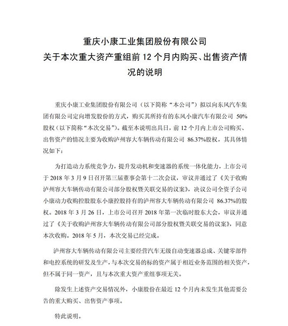 对于此次重组,东风汽车有关负责人认为,通过此次重组,虽然放弃了对盈利能力较强的子公司的少数股权,但借此成为了小康股份的重要股东,实现了国有资产的保值增值;同时,打开了在高端汽车及相关零部件、智能电动车领域的更广阔蓝海,有助于市场各方互利共赢,也有力践行了国企鼓励、支持、引导和保护民营经济发展的号召。