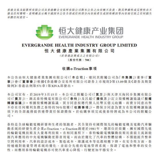 恒大5亿元收购泰特机电70%股份,布局新能源汽车全产业