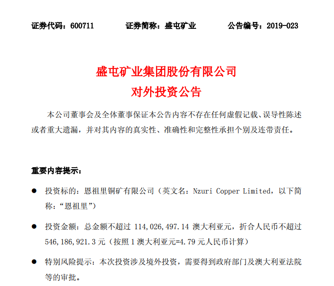 2月26日晚间,盛屯矿业(600711)公告显示,公司间接全资控股子公司旭晨国际拟不超过5.46亿元收购澳洲矿商恩祖里100%股权。本次交易完成后,恩祖里将成为公司的全资子公司。