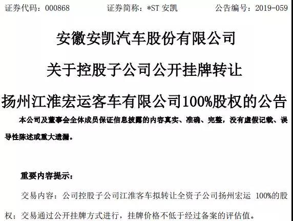 7月31日,安凯客车发布公告称,公司控股子公司江淮客车于2019年6月4日通过安徽省产权交易中心公开挂牌转让扬州宏运100%股权,转让底价2,838.52万元。 [详细]