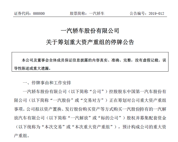 公司因筹划重大资产置换及发行股份和可转换债券、支付现金购买资产并募集配套资金(以下简称“本次重组”或“本次重大资产重组”)事项,为保证公平信息披露,维护投资者利益,经向深圳证券交易所申请,公司股票(证券简称:一汽轿车,证券代码:000800)自2019年3月28日(星期四)开市起停牌,公司分别于2019年3月28日、2019年4月4日披露了《关于筹划重大资产重组的停牌公告》(公告编号:2019-012)、《关于筹划重大资产重组停牌进展暨继续停牌的公告》(公告编号:2019-020)。