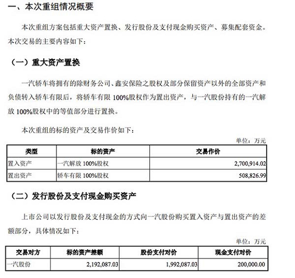 而早于今年4月11日,一汽轿车曾发布公告,称一汽轿车以拥有的除财务公司、鑫安保险股权及部分保留资产以外的全部资产和负债作为置出资产,与一汽股份持有的实施部分资产调整后一汽解放100%股权中的等值部分进行置换,公司拟以发行股份和可转换债券、支付现金的方式向一汽股份支付置入资产与置出资产的差额部分。