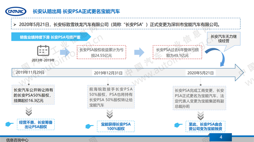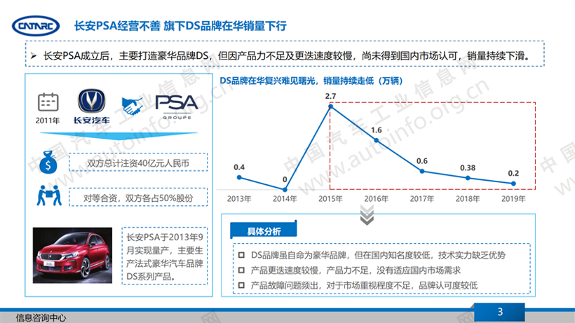 长安PSA成立后,主要打造豪华品牌DS,但因产品力不足及更迭速度较慢,尚未得到国内市场认可,销量持续下滑。2020年5月21日,长正式变更为宝能汽车,至此,长安PSA由合资公司变为宝能独资。