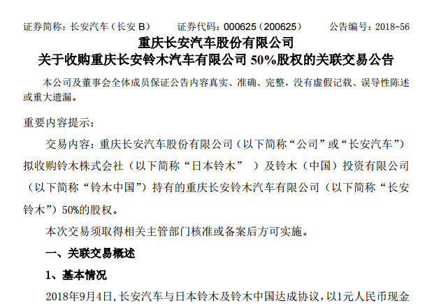 定了!长安汽车1元收购长安铃木50%股份