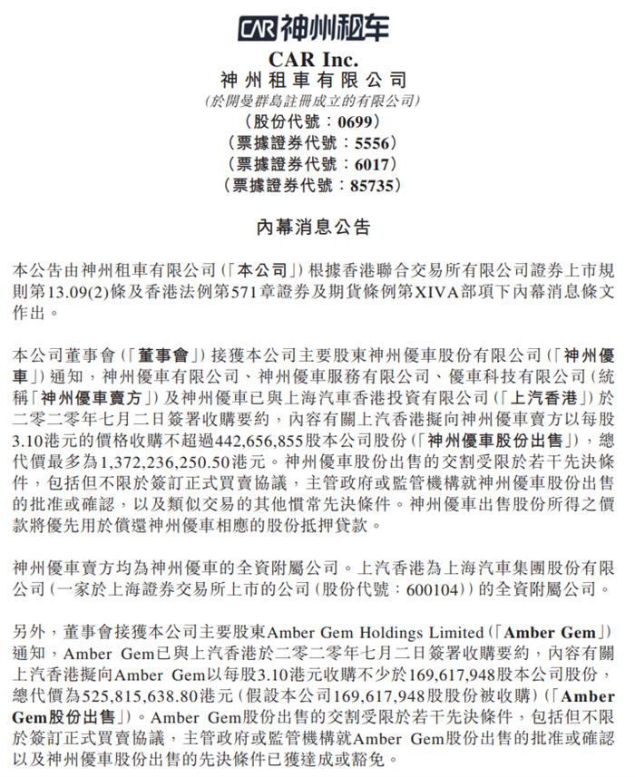 上汽集团7月2日晚发布公告称,公司全资子公司——上海汽车香港投资有限公司(以下简称“上汽香港”)与神州优车股份有限公司及其子公司UCAR