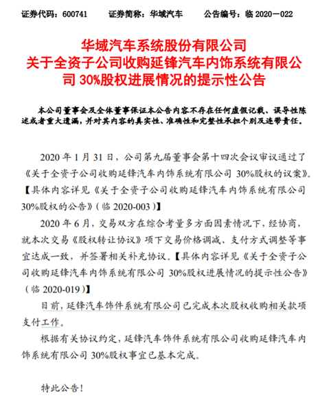 华域汽车在此次公告中称,目前延锋公司已完成本次股权收购相关款项支付工作。根据有关协议约定,延锋公司收购延锋内饰30%股权事宜已基本完成。
