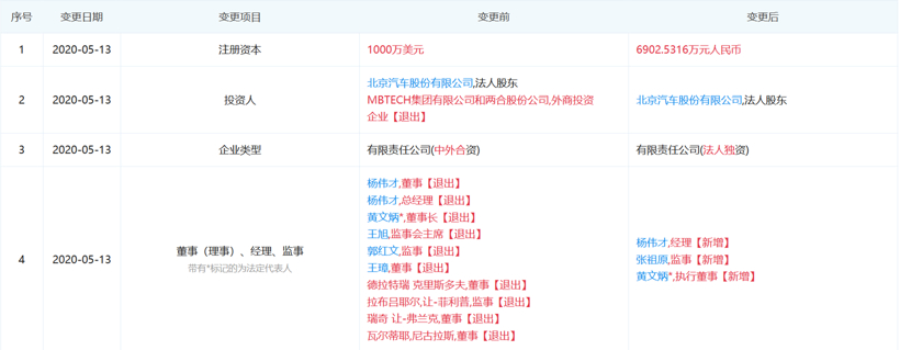 盖世汽车从企查查网站上了解到,上述股权变更事实上在今年5月份就已经完成。5月13日,北汽德奔的工商登记信息进行了调整,注册资本从1000万美元变更为6902.5316万元, 企业类型由中外合资变更为中方独资,高管团队中的外籍人员则全部退出。