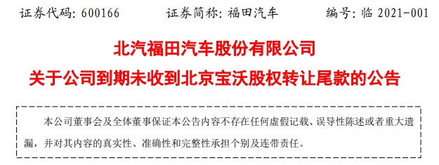1月5日,福田汽车发布公告,截至2020年12月31日,公司尚有1,671,485,577.70元(含利息)北京宝沃股权转让尾款未收到。公司正在积极与债务人及担保人协商还款计划及增补担保措施方案,并将采取法律手段清收债权。