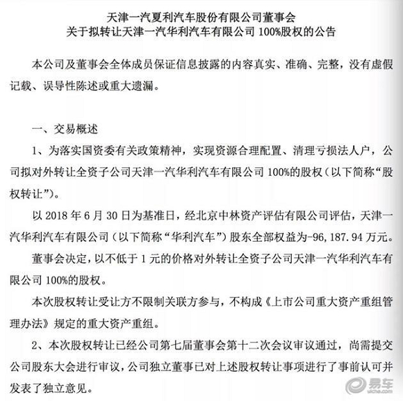 这项决议需追溯到7月20日,一汽夏利发布的另一则公告,该公告称:为清理亏损法人户,公司拟以不低于1元的价格,对外转让全资子公司华利汽车100%股权。