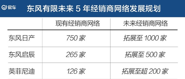 其中东风日产会将经销商网络拓展至1000家,东风启辰拓展至500家,英菲尼迪同样也将得到拓展。