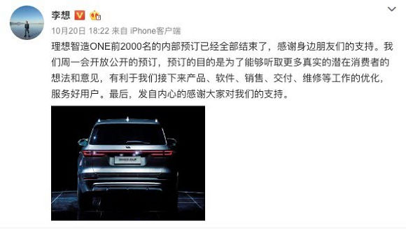 10月20日,在车和家理想制造One品牌和产品发布会2天之后,车和家CEO李想发微博表示,将这款车的预订时间提前半年,于10月22日正式接受预定。而此前发布会上,这款车原定的预订时间是明年4月上海车展。