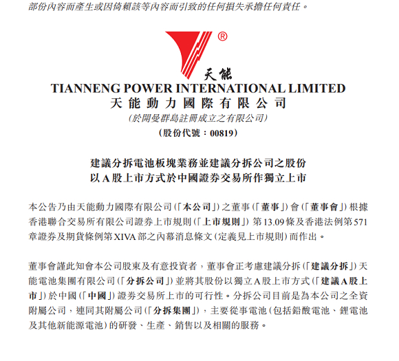 近日,天能动力(00819.HK)公告称,公司董事会正建议分拆电池板块业务,并建议分拆公司的股份以A股上市方式于中国证券交易所作独立上市。