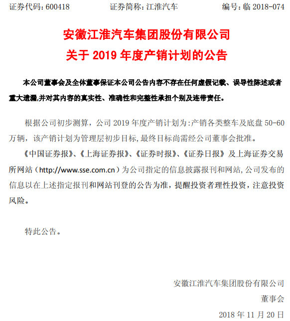 11月20日,安徽江淮汽车集团股份有限公司(下称“公司”)发布关于2019年度产销计划的公告。