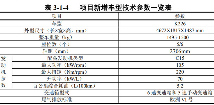 K226动力采用包含1.5L的四缸增压发动机(C15)在内的最新一代智能电驱系统。其拥有双电机双行星齿轮机构,使得发动机及电机能在最优工作区域工作,兼顾整车动力以及燃油经济性。1.5T发动机最大功率为105kW,峰值扭矩达到220Nm,排放满足国六标准,传动系统匹配6速自动变速箱或5速手动变速箱。