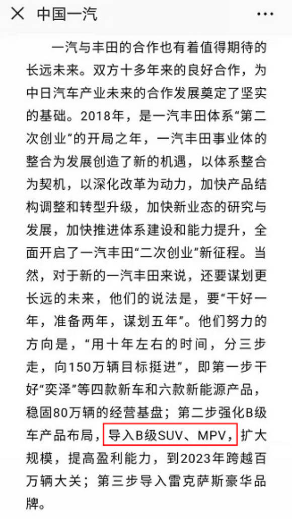 规划中显示,一汽丰田要向150万辆销量目标挺进,而销量的增长依赖于完善的产品阵容。随着汽车市场消费升级,一汽丰田也将发展重点瞄准B级车市场,将导入B级SUV、MPV,至2023年突破年销百万辆。
