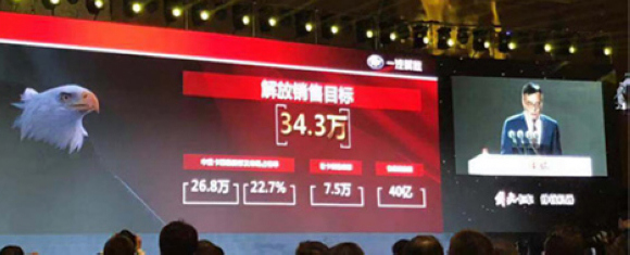 一汽解放汽车有限公司总经理助理、一汽解放销售有限公司总经理、党委书记王志才先生在做主题报告时提出了一汽解放2019年的解放销售及发展目标:“2019年,解放销售目标为34.3万辆,建立起中国第一,世界一流的商用车营销体系。坚定的实现四个一:扩大牵引产品第一优势、巩固载货产品第一地位、自卸产品行业排名再进一位、轻卡产品销量行业增速实现第一。”