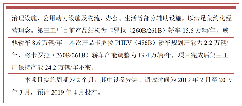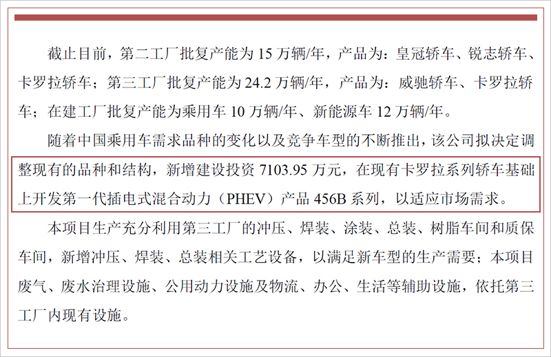 根据公示内容,本次增建项目将投资7103.95万元,在现有卡罗拉系列轿车基础上开发卡罗拉PHEV产品。该项目将充分利用第三工厂的冲压、焊装、涂装、总装、树脂车间和质保车间,并新增冲压、焊装、总装相关工艺设备,以满足新车型的生产需要。