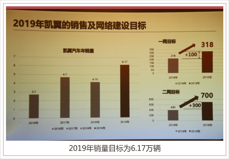 自2019年起,凯翼汽车公司整体入驻宜宾和成都,目前已在此拥有了独立的生产基地和研发中心,标志着凯翼汽车跨入了一个全新的时代。1月17日,凯翼汽车公司总经理助理、凯翼营销公司常务副总经理李春祥表示:“2019年,凯翼将做到‘四新’,包括新品牌、新工厂、新产品以及新服务,为迎接凯翼全新产品的上市打好坚实基础。”另据透露,2019年凯翼汽车将销量目标定为6.17万辆。