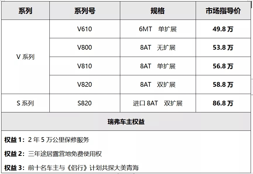 瑞弗车主将享受到2年5万公里保修、三年途居露营地免费使用权等权益。