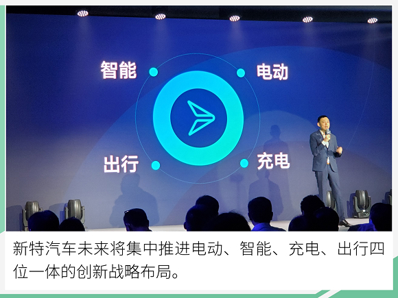 面对车市下行的压力,今年上半年,新特汽车进行了全新战略布局的调整,未来新特汽车将摒弃传统主机厂单一的汽车制造和销售模式,集中推进“电动”、“智能”、“充电”、“出行”四位一体的创新战略布局,以更多元化的商业模式迎接市场挑战。