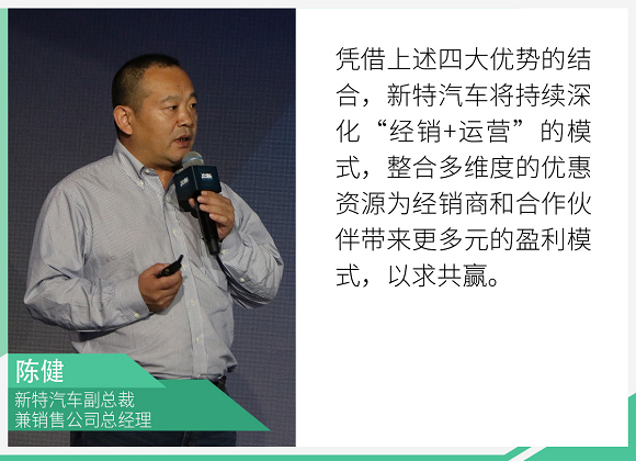 新特汽车副总裁兼销售公司总经理陈健表示:凭借上述四大优势的结合,新特汽车将持续深化“经销+运营”的模式,整合多维度的优惠资源为经销商和合作伙伴带来更多元的盈利模式,以求共赢。