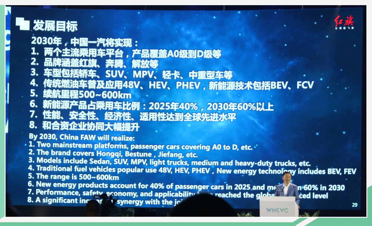 产品方面,纯电动车型续航里程将在2030年普及到500-600公里。在此基础上,中国一汽将在2025年将新能源车型在乘用车中的占比提高到40%,在2030年达到60%以上。同时,中国一汽将在2030年把产品的性能、安全性、经济性、适用性提升到全球领先水平,并进一步提高与合资企业的协同性。