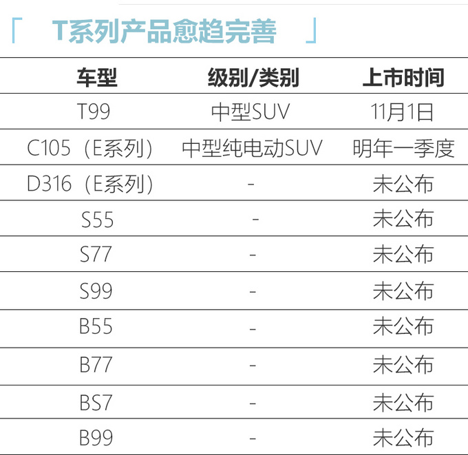 B系列产品定位于 “年轻态新美学越级时尚车”,未来将推出B55、B77、BS7、B99等车型;E系列产品定位于“年轻态新美学电动智享车”,将推出奔腾C105、D316等新能源车型;S系列定位于“年轻态新美学高端家用车,S55、S77、S99等将成为主力;T系列产品,大家应该很熟悉,定位于“年轻态新美学科技潮流车”,目前已陆续推出奔腾T77、T33两款“T”系列车型,大五座旗舰SUV奔腾T99也将于11月1日正式上市。