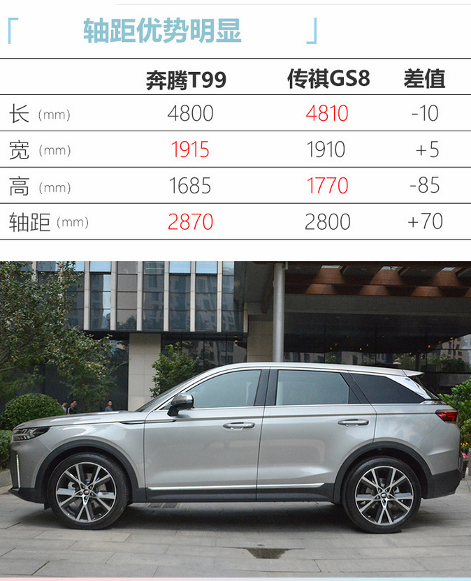 奔腾T99目前已开启预售,预售价区间为15.99万-19.99万。新车与红旗HS5同平台开发,车身尺寸优势较为明显,尤其是轴距数据,远超传祺GS8等同级竞品,保证了更为宽敞的后排空间。动力部分搭载了一汽最新研发的型号CA4GC20TD-32(2.0T)的发动机,热效率达39%,满足国六排放标准,传统系统匹配8AT变速箱。另外,奔腾T99在造型设计、智能化科技等方面也代表了新奔腾的最高水准,综合实力强劲。
