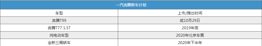 自奔腾推出全新产品序列——“T”系列后,凭借全新的外观设计、科技和产品性能,有意重新在市场进行突围。随着奔腾T77(参数|询价)、T33车型的陆续上市,如今奔腾品牌也已经全面焕新。日前,我们获得了奔腾品牌接下来的新产品计划,其中包括奔腾T99车型、奔腾T77 1.5T版本、纯电动车型以及一款全新的三厢轿车。详细信息,见下表。