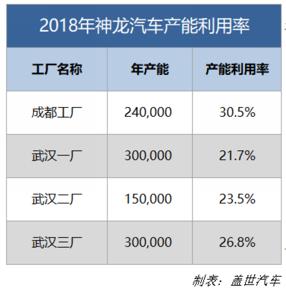 资料显示,1992年,东风汽车集团有限公司与法国PSA集团的合资公司——神龙汽车成立。神龙汽车分别在武汉和成都设有工厂,如今,神龙汽车在武汉拥有三个完整的乘用车制造工厂,再加上成都工厂,四大工厂累计年产能达近百万辆。而盖世汽车研究院根据神龙汽车2018年度销量统计的结果显示,神龙汽车四大工厂2018年的产能利用率最高仅为30.5%。